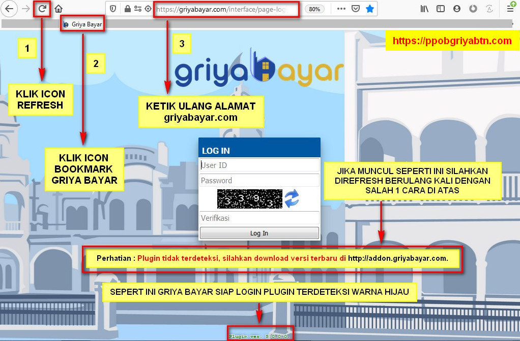 Saat login web transaksi  https://griyabayar.com muncul konfirmasi “tidak berhak login disinidan bagian bawah kolom login muncul “Perhatian : Plugin tidak terdeteksi, silahkan download versi terbaru di http://addon.griyabayar.com